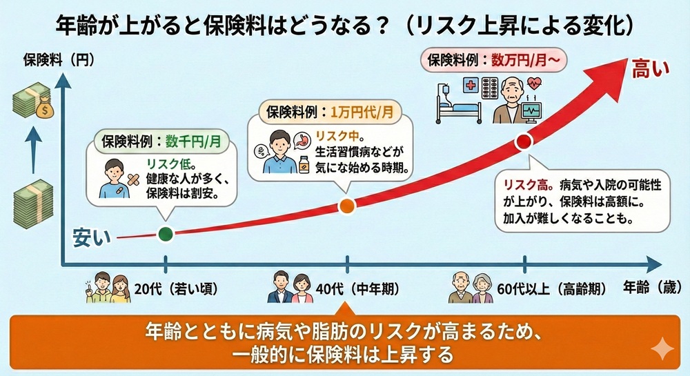 生命保険の保険料は、加入時の年齢ごとのリスク計算に基づいて設定されるため、基本的には年齢が上がるほど保険料は高くなります。そのため、見直しによって同じ保障内容の保険に入り直そうとしても、年齢上昇分だけ保険料が割高になるのはよくある話です。