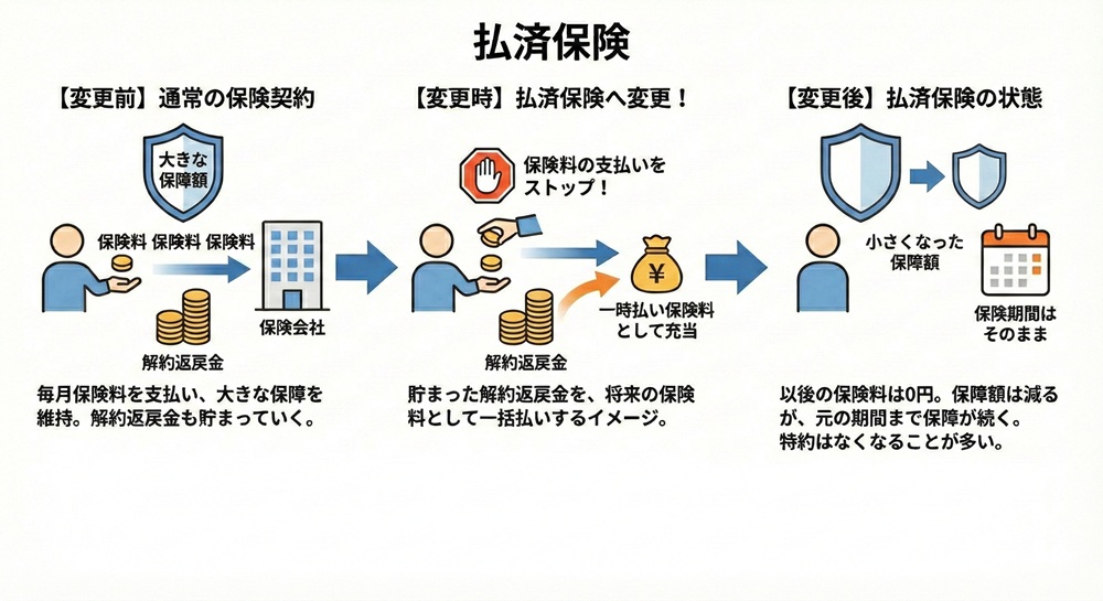 「払済保険(はらいずみほけん)」は、現時点の保険契約を解約せずに、以後の保険料の支払いを停止する制度です。その時点での解約返戻金を一時払い保険料に充当し、元の契約と同じ保険期間のまま、保障額を小さくした保険に変更します。