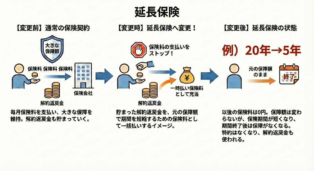 「延長保険(えんちょうほけん)」は、払済保険と同様に以後の保険料支払いを中止し、その時点の解約返戻金をもとに保険を変更する制度です。払済保険との違いは、保障額を元の契約のまま維持し、その代わりに保険期間が短くなる(定期保険になる)点にあります。