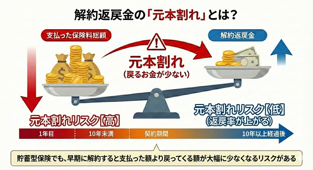 終身保険や養老保険などの「貯蓄型保険」を中途解約する場合、解約返戻金がそれまでに支払った保険料の総額を下回ることがあります。とくに契約からまだ年数が浅い時期に解約すると、解約返戻金がほとんど戻ってこないケースもあるくらいです。
