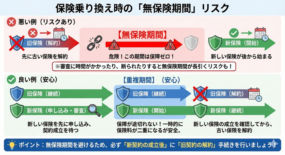 一定期間は保険料が二重に発生する可能性があるものの、リスク管理の観点からは重複期間を設けるほうが安全です。
