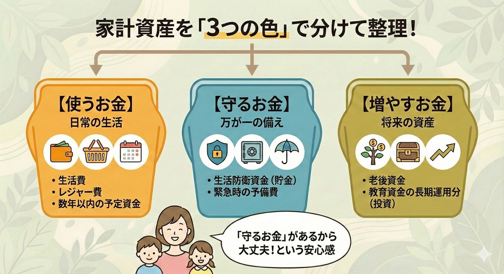 家計の資産を役割ごとに「色分け」して整理する手法を取り入れると、貯金と投資の割合が驚くほどスムーズに決まります。使う・守る・増やすの3つに分けて管理することで、家計簿が明確になるでしょう。